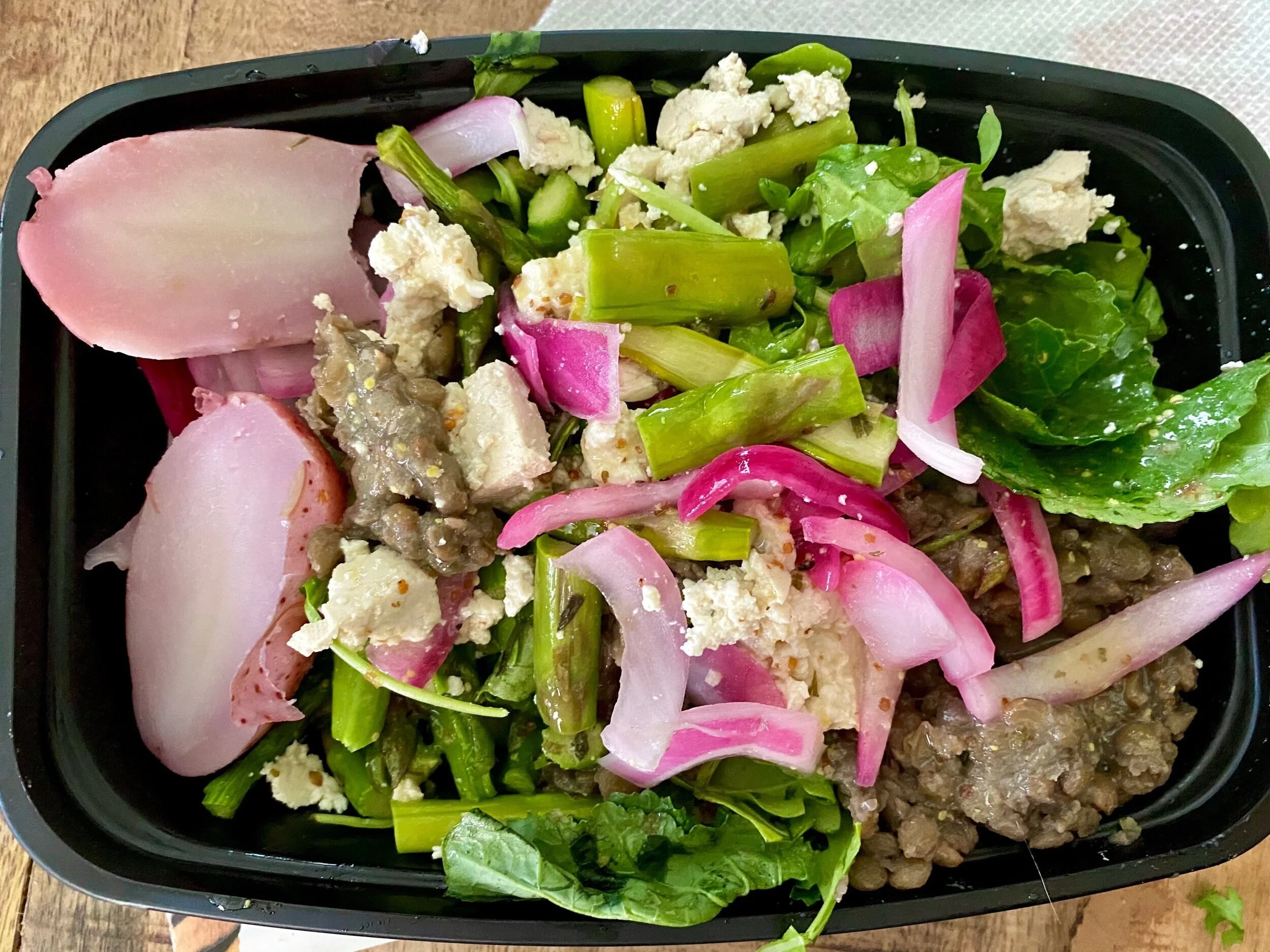 Fresh, light and refreshing—this salad has mixed greens, arugula, asparagus, pickled red onion, lentils, tofu feta crumbles and fingerling potato with a lemon Dijon vinaigrette on the side. (V, GF, Nut Free)
